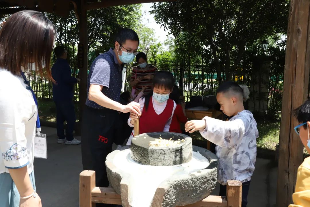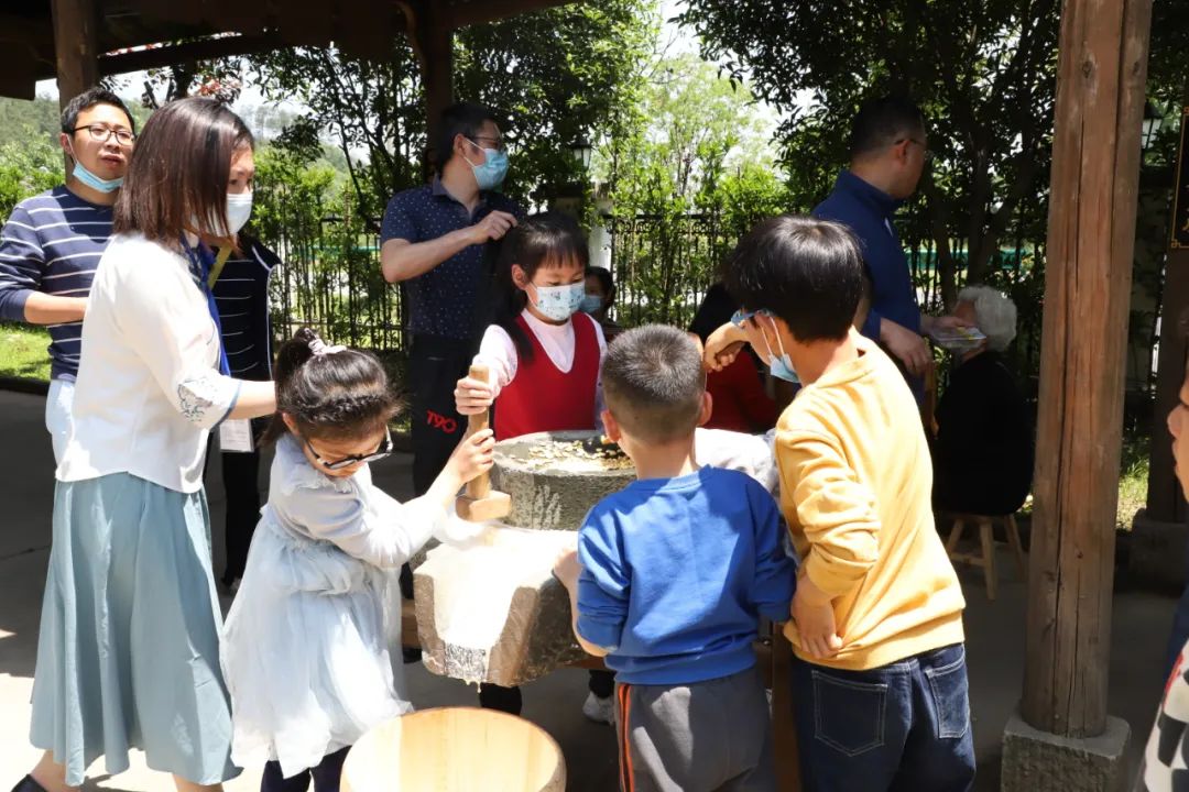 在位于休寧縣五城鎮(zhèn)中國徽州豆腐文化園內(nèi)的徽州豆腐博物館,市民和游客駐足參觀傳統(tǒng)豆腐制作使用的工具,還有家長帶著孩子體驗磨豆的樂趣。